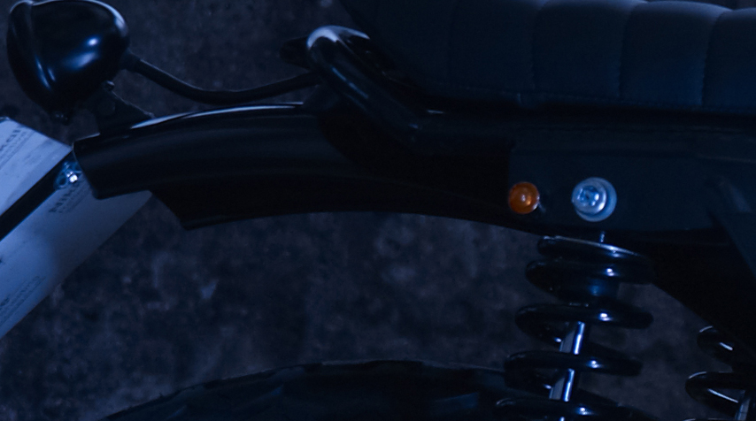 - Fork legs, handlebar, bespoke mudguards and levers shiny black powder coated.