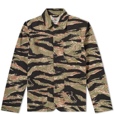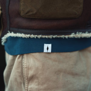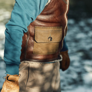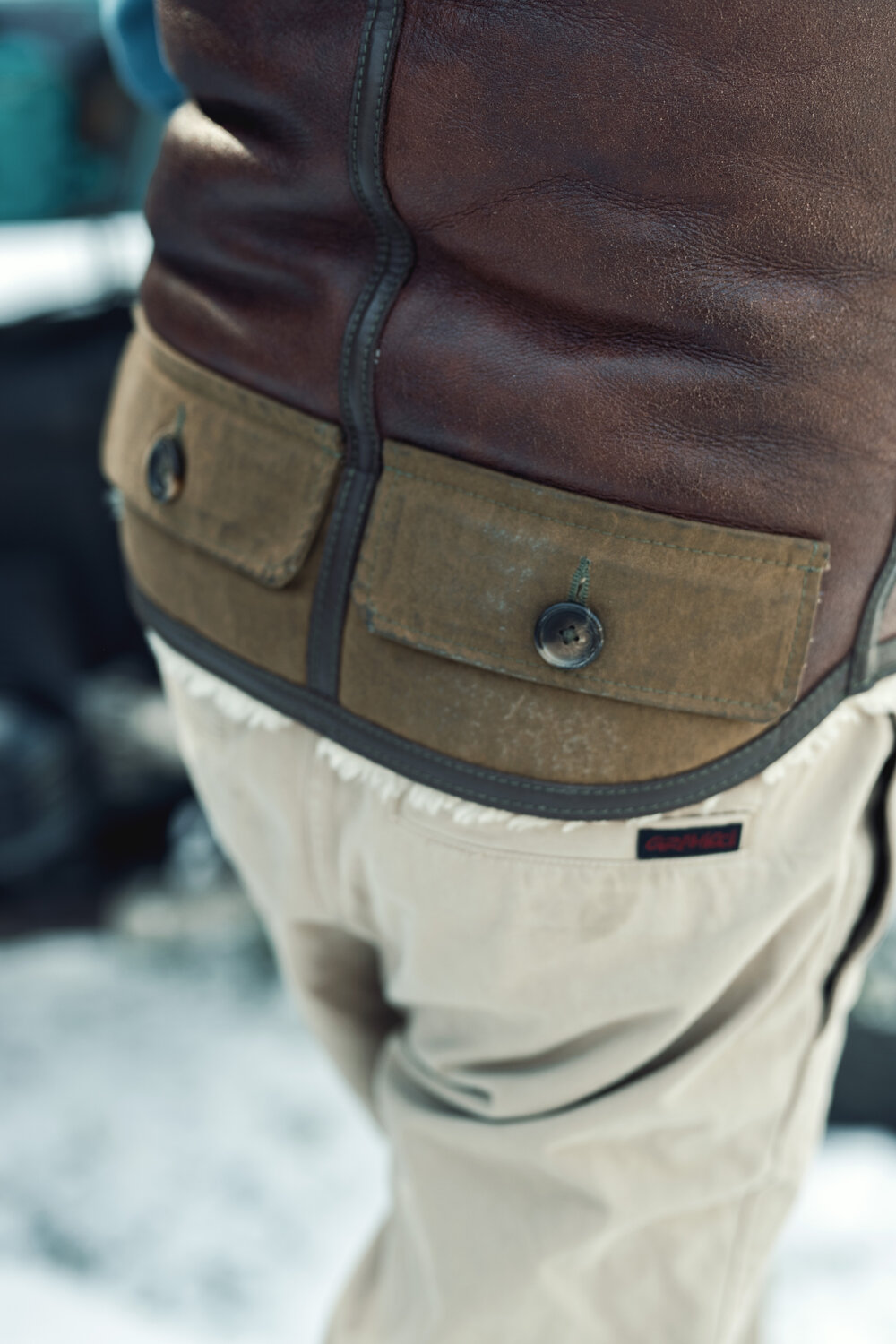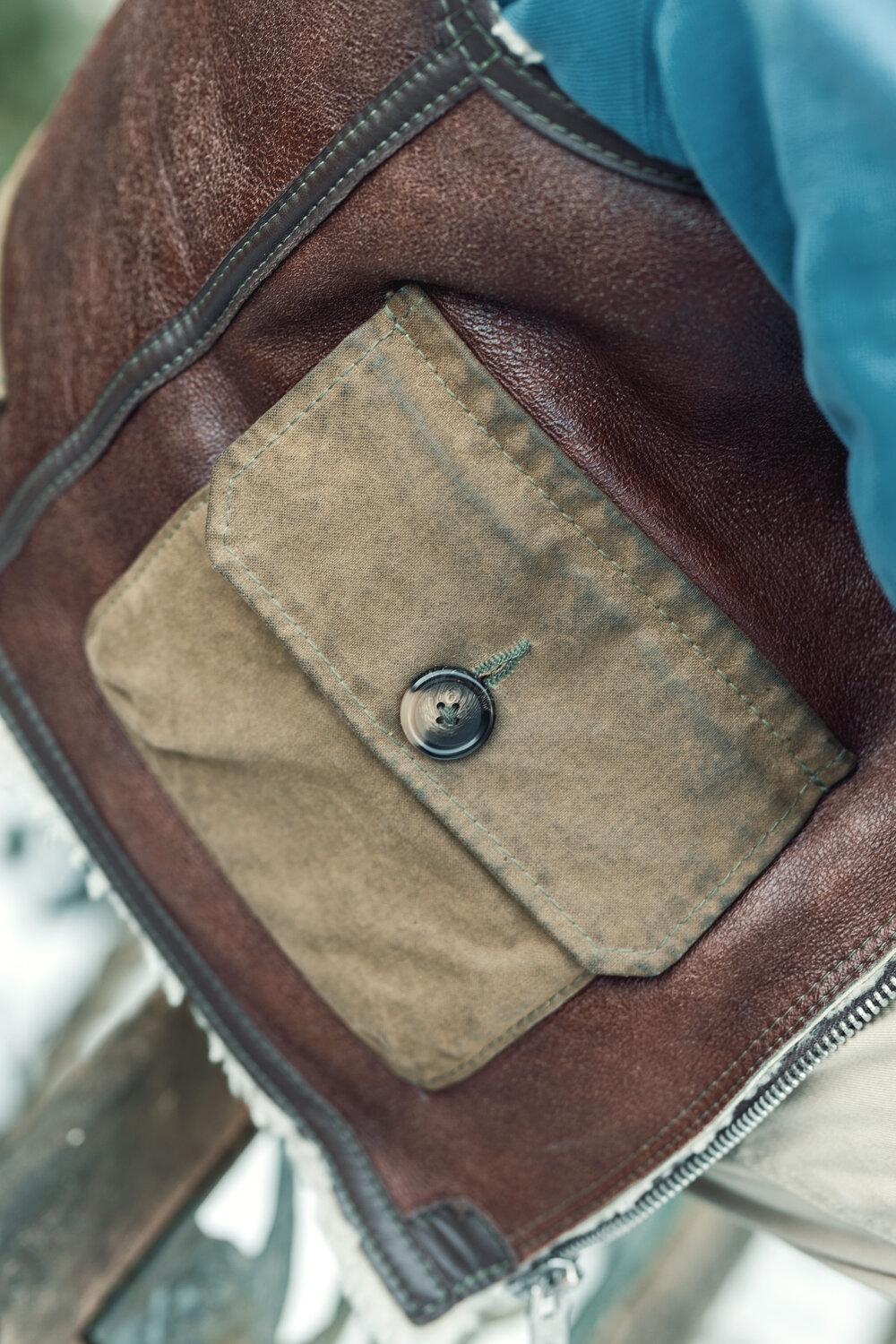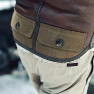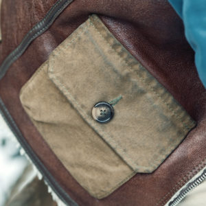 Heavy canvas front bellow pockets with hand sewn button fastening and “Blitz” thunderbolt stitched in olive thread.