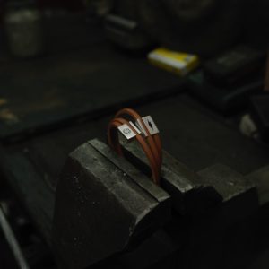 This simple sleek bracelet made from vegetable tanned calf leather has a special twist to it: at first glance, it looks like a plain leather cord wrapped around the wrist and bound by brass clasps. Length of the cord: 65 cm.