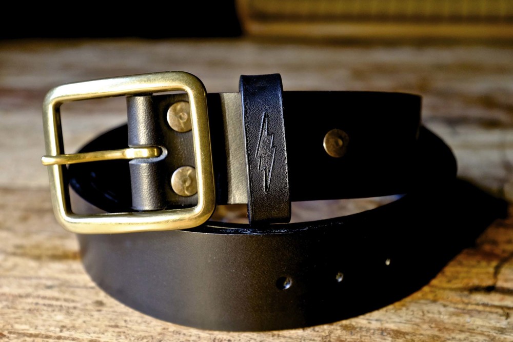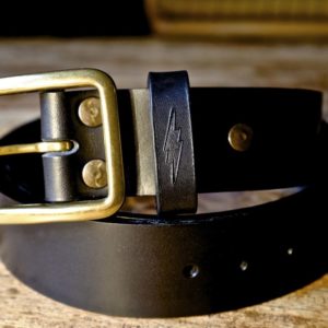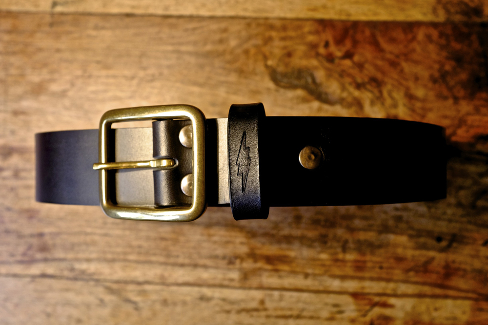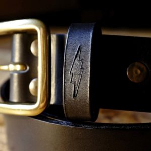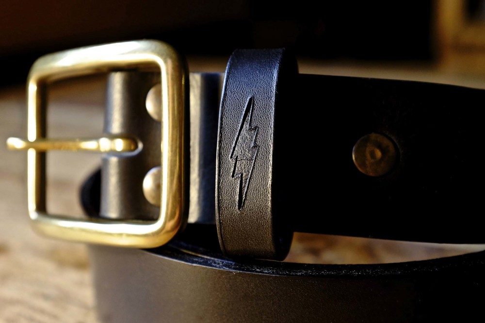 Blitz Motorcycles thunderbolt engraved on the belt loop.